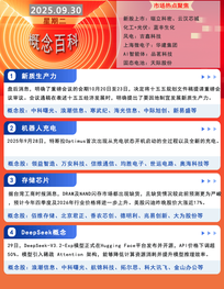 特别提示:下文涉及的题材或公司,内容罗列和篇幅长短,与后续涨跌无关,亦均非进行推荐,仅作研究辅助。投资者应自主决策,注意风险。 一、市场热点 金属:黄金、白银、钴等金属价格持续创阶段新高 ◇驱动:2025年9月29日,黄金、白银、钴等金属价格大涨,其中金价续刷记录新高、银价创十四年来记录新高,机构表示随着美国降息预期增加,叠加国内“金九银十”旺季需求预期结构性改善,金属价格将继续上行。 ◇黄金:2025年9月29日盘后,现货黄金日内涨1.88%,报3831美元/盎司,续刷记录新高。 ◇黄金核心公