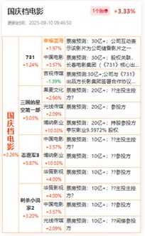 ):获《731》道具模型独家生产权,首款“细菌战实验室”盲盒预售情况良好,联名“喜羊羊”玩具电商销量翻倍,IP变现率得到提升。 分众传媒(002027):《731》电梯广告曝光10亿次,与蒙牛联名主题奶盒带动Q3广告收入增长15%,2亿白领受众形成“观影决策闭环”