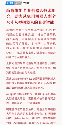 )卡位核心硬件环节,成长弹性再升级 高通推出的全套机器人技术组合(通用架构+Dragonwing™ IQ10处理器+生态联盟),是其在人形机器人与工业AMR领域的技术商业化关键一步。结合美格智能此前与高通、阿加犀联合推出“通天晓”人形机器人并实现SNM970模组落地的背景,公司将从技术协同、生态卡位、订单拓展三大维度深度受益,人形机器人业务从“单一客户验证”进入“高通生态放量”阶段,成