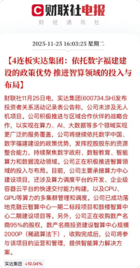 实达集团 —— 福建 + AI + 机器人:算力服务的区域补涨核心 涨停细节:4 连板,09:31 封板,成交额 15.21 亿,换手率 12.89%,流通市值 121.74 亿。 概念板块:福建区域、AI、机器人、信息产业 - 软件服务。 驱动因素: 算力服务收购落地预期:公司拟 1.85 亿元收购数产名商 95% 股权,标的主营算力服务、数据服务,2025 年前十月算力业务营收增