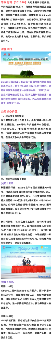 🔥华润材料【301090】:瓶片涨价风暴下的唯一王者。公司PETG特种瓶片聚酯是实现国产替代的顶级存在! 🍎【瓶片涨价风暴来袭】油主力合约涨超17%;对二甲苯、PTA主力合约触及涨停,涨幅为13%;瓶片主力合约触及涨停,涨幅12%;丙烯、纯苯、短纤涨超10%。 💎【政策红利双击】环保法典促使禁塑令升级+出口退税13%!公司PETG技术国内领先,6万吨产能已落地,二期即将投产,海外收入占比超1/3,东南亚市占率持续霸榜! 🚀【技术+盈利双爆发】自主研发PETG纯度99.97%,毛利率比普通