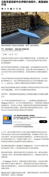 马斯克星链套件在伊朗价格飙升,美国威胁开战 作者:洛妮・普林蒂斯、玛丽莎纽曼与弗雷顿波亚 发布时间:February 20, 2026 at 11:18 PM GMT+8 美国自伊拉克战争以来在中东最大规模的军队部署,正导致埃隆・马斯克的星链终端在伊朗黑市价格飙升 —— 当地民众担忧战争可能引发新一轮全国性断网。 据关注伊朗局势的销售商与人权组织透露,这些因能提供未经审查的网络接入而被当局禁止的走私设备,价格已飙升至高达 4000 美元。而在去年 6 月伊朗 - 以色列冲突爆发前,同类设备售价仅