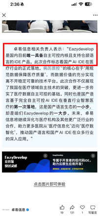 卓易信息,鸿蒙IDE最核心标的! 1. 公司旗下EazyDevelop产品全面支持鸿蒙编程核心语言仓颉,鸿蒙编程首选软件! 2. 卓易信息是国内IDE行业唯一上市公司,即将在鸿蒙生态的开发工具方面取得突破性进展,商业化后按照license收年费,500万鸿蒙开发者*1000元/人=50亿收入空间,唯一开发商,颠覆鸿蒙开发生态! 鸿蒙新龙头即将腾飞!