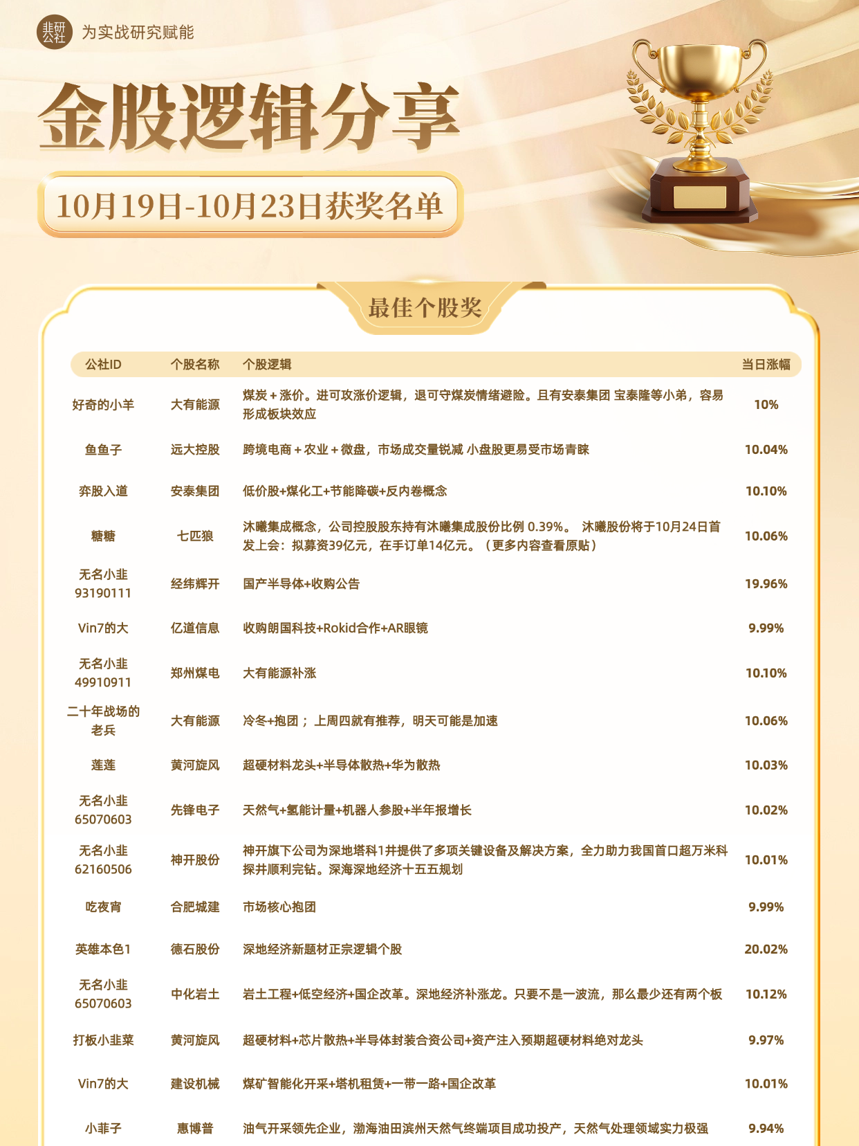 第七周金股逻辑分享名单出炉啦 感谢大家的参与和分享 祝大家股市长虹 本期金股逻辑分享链接如下,欢迎查看 1019金股逻辑分享 1020金股逻辑分享 1021金股逻辑分享 1022金股逻辑分享 1023金股逻辑分享