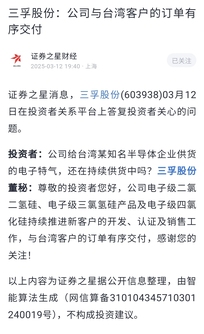 S三孚股份(sh603938)S: 公司与台湾客户的订单有序交付