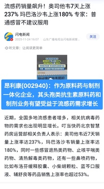 S昂利康(sz002940)S 11月以来,全国流感活动快速上升,北京已迈入呼吸道传染病高发期。有数据显示,奥司他韦近7天销量暴涨237%,速福达(玛巴洛沙韦)涨幅达180%。11月24日下午,记者走访北京多家药店及医疗机构发现,尽管购药需求激增,热门抗流感药均库存充足,线上线下均可购买或预订。当天15时许,北京儿童医院二楼内科门诊里挤满等候就诊的家长和孩子,等候区的座椅坐满了人,截至当天16时30分,记者在医院负一层采样处看到,等候检测的患者已排到1200多号。(央广网) 当前流感药销量大幅增