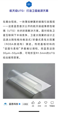 蓝思科技表示,与北美大客户已有10年深度合作,参与大客户智能座舱、人形机器人、商业航天等多项核心业务。在商业航天方面,公司已批量出货卫星地面接收器外观件、结构件模组。 其次是在光伏太阳能基建领域的最新技术突破 1、技术卡位核心痛点:公司UTG厚度仅30-50μm,可弯折至R1.5mm弧度,兼具无机玻璃的抗原子氧/紫外老化特性与极致柔性,是卫星能源系统柔性转型的刚需材料。2、产能与成本优势:公司凭借折叠屏领域成熟的化学强化与激光切割工艺确保UTG在太空极端环境下的可靠性。#其消费电子级别的规模化产