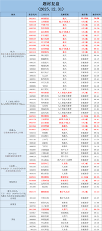 今天,机器人板块替代了商业航天,上演涨停潮。 机器人 1)港股“协作机器人第一股”越疆启动回A计划; 2)全国首部!杭州为具身智能机器人产业发展立法; 3)CES大秀倒计时:黄仁勋、苏姿丰同日亮相 机器人混战一触即发; 4)智元机器人天团全能首秀湖南卫视跨年舞台! 5)工信部等四部门:重点攻关仿真设计、研发测试、中间件与操作系统等基础软件,智能机器人、智能检测设备等关键装备,以及信息物理系统等关键核心技术,鼓励企业应用自主可控技术产品,提升产业链供应链韧性和安全水平; 6)马斯克设想人形机器人将