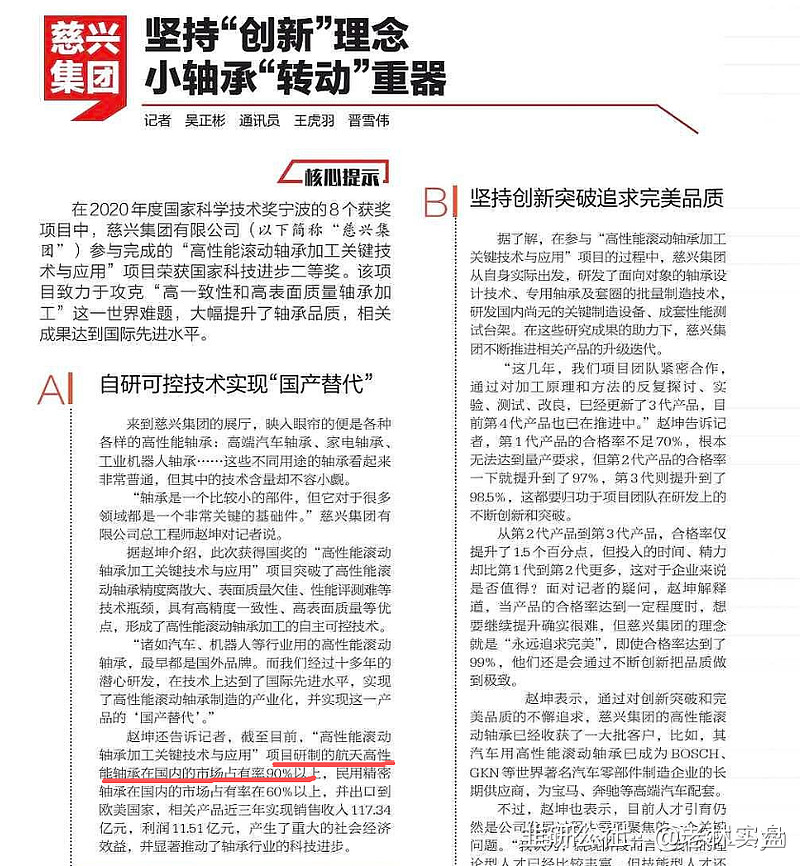 S天创时尚(sh603608)S 通过控股股东慈兴集团深度切入商业航天领域,形成"轴承技术+航天供应链"双轮驱动,以下是核心逻辑与业务梳理: 一、核心业务布局:商业航天轴承垄断性地位 市场占有率与技术壁垒 国内市占率90%:慈兴集团主导航天级轴承研发生产,产品覆盖卫星姿态控制轴承(如交叉滚子轴承)、火箭涡轮泵轴承等关键部件,技术指标达到国际领先水平(耐温范围-180C~+250C,真空环境适配)。 直接客户 航天科技/科工集团:为北斗卫星、遥感卫星提供轴承,2025年航天业务营收占比15%。 商