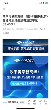 效率再攀新高峰!琏升科技钙钛矿/晶硅异质结叠层电池效率达33.45%!