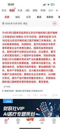 11:45:56【国家药监局在北京召开脑机接口医疗器械工作推进会】财联社12月19日电,国家药监局12月18日在北京召开脑机接口医疗器械工作推进会。会议听取高等院校、科研院所、医疗机构相关专家学者和研发企业代表意见建议。国家药监局党组成员、副局长雷平出席会议并讲话。会议要求,要深入贯彻落实党的二十届四中全会精神,深刻领会脑机接口作为前瞻布局未来产业的重要战略意义;要坚持安全有效为首要前提,创新审评监管方法,构建标准体系,加强技术指导服务;要加强跨部门合作,联手产学研医各方,合力解决关键技术问题,