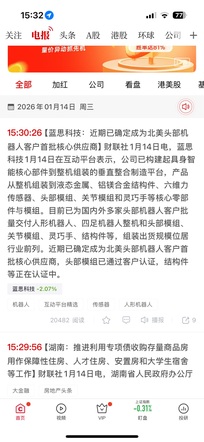 港股蓝思科技正在低位,等风来 15:30:26【蓝思科技:近期已确定成为北美头部机器人客户首批核心供应商】财联社1月14日电,蓝思科技1月14日在互动平台表示,公司已构建起具身智能核心部件到整机组装的垂直整合制造平台,产品从整机组装到液态金属、铝镁合金结构件、六维力传感器、头部模组、关节模组和灵巧手等核心零部件与模组。目前已为国内外多家头部机器人客户批量交付人形机器人、四足机器人整机和头部模组、关节模组、灵巧手、结构件等,组装出货规模位居行业前列。近期已确定成为北美头部机器人客户首批核心供应商,