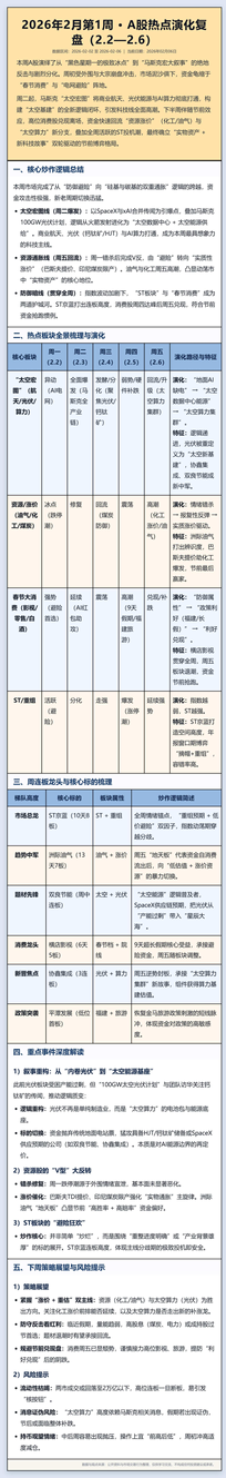 本周A股由避险转向“太空宏图重塑+通胀博弈”。马斯克叙事打通商业航天、光伏与AI算力,“太空算力”抬升双良节能、协鑫集成等估值;下半周资金自高位消费回流资源涨价,化工/油气走强,洲际油气辨识度最高。ST投机与春节档维持活跃,ST京蓝、横店影视各领风潮。节前格局确定为“实物资产+新科技”双主线。 注:内容来自网络,未经核实,不构成任何投资建议,请谨慎参考!如有侵权,请私信联系删除!欢迎各位老师点赞、评论、转发,谢谢!