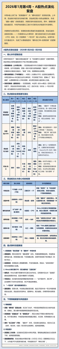 本周A股演绎了从“通胀疯牛”到“硬科技回归”的惊险切换。上半周,受金银价格历史性突破刺激,有色资源板块加速逼空,成为绝对主线并虹吸全场流动性。周四随着高位筹码松动,资金开始尝试向白酒等低位防御板块切换。周五资源股集体杀跌引发指数剧震,资金先后流入有“一号文件”博弈预期的农业种业,以及有强业绩逻辑的光通信(CPO)。全周在巨量博弈中,成功完成了从“资源避险”向“科技业绩+政策防御”的逻辑软着陆。 注:内容来自网络,未经核实,不构成任何投资建议,请谨慎参考!如有侵权,请私信联系删除!欢迎各位老师点赞