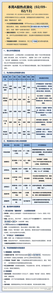 蛇年收官周成交维持2万亿+,资金围绕稀缺性定价。字节Seedance 2.0引爆AI应用,横店影视、掌阅科技走强;谷歌云/优刻得提价,算力租赁、液冷与电子玻纤布受捧,大位科技、宏和科技受益;资源端染料与钨链涨价,百川股份、章源钨业获关注;避险情绪抬头,*ST铖昌成资金抱团标的。 注:内容来自网络,未经核实,不构成任何投资建议,请谨慎参考!如有侵权,请私信联系删除!欢迎各位老师点赞、评论、转发,谢谢!