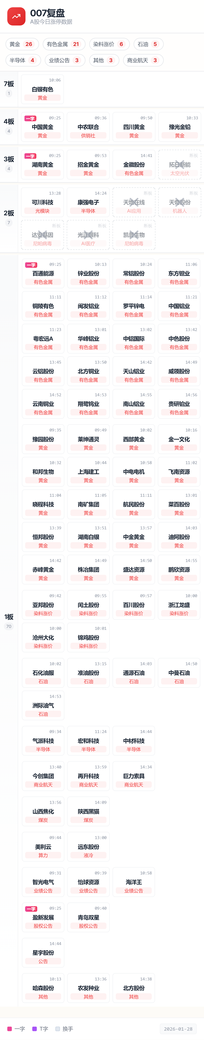 一图胜千言,今日依然是情绪指数双降的一天,指数已经连续多天出现高度控盘迹象了,那么市场对于指数的波动反应还会这么大吗,这是一个值得思考的问题,而答案大概率明天就能公布,所以明天大概率对于短线情绪来说是一个节点,首先今日的有色金属已经高潮,明日有分歧预期,分歧就是去弱留强,有色金属对于市场流动性的虹吸效应就不会那么强,资金有流出,别的题材就能获得更多的流动性。第二是,有色金属板块已经连续高潮多日,板块内多支核心即将触碰异动,那么已经进入异动的像四川黄金和湖南白银的反馈将决定板块的高度是继续向上还是