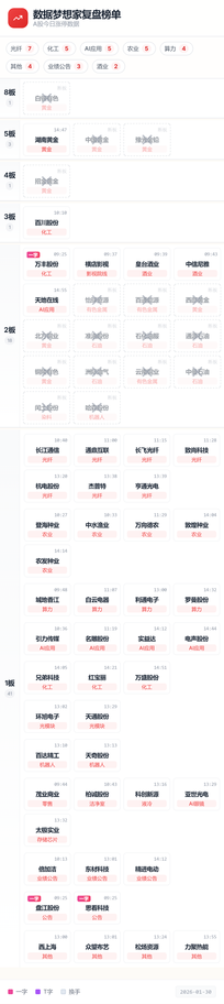 一图胜千言,从榜单中我们可以看到今天最强的题材是光纤,诱因是meta订康宁40亿美元订单,之前的消息今天逆着指数下跌往上涨也是非常强的,最主动的就是地天的通鼎了,他的上涨带动了长飞,长江等。所以次日关注通鼎的溢价即可,如果溢价不及预期就要小心板块兑现,因为这个板块之前消息刚出来的时候是炒过一波套过不少资金的。 次强的就是化工和ai应用了,ai应用是天地和引力的转强带动,化工是避险属性的抱团,化工尾盘加强的逻辑是目前市场的最高标是湖南黄金的5板,其次就是百川的3板,百川下面还有个二板的一字万丰,那