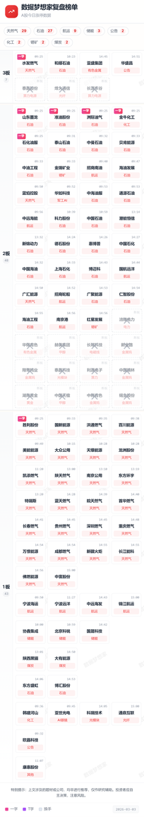 昨天复盘,我们说过冰点比较抗跌的题材次日的修复预期会比较强,但是我们竞价可以看到,昨日抗跌的题材并没有主动性。 美伊冲突: (1)石油: 美伊题材的石油和天然气,竞价开的就不及预期,后排竞价有资金抢跑出现负反馈。包括期货这边,开盘后就一直是往下回落然后震荡的,消息面上伊朗允许中俄的船只过海峡,那么海峡关闭导致的价格上涨预期降低,市场开始出现兑现潮也是正常预期,结合消息面加上竞价的表现,就要抓紧跑了,除非你手上的是很核心的你可以博弈一下情绪的溢价。 (2)天然气+航运: 美伊题材中的石油都不行了,