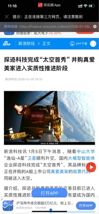 ai智能体+太空卫星+阿里巴巴投资+服务关联阿里 新浪科技讯 1月5日下午消息 ,随着中山大学“逸仙-A星”卫星顺利升空,国内大模型智能体企业探迹科技完成“太空首秀”,其品牌标识和正在并购的A股上市公司真爱美家的股票代码一同被送入太空。 据介绍,探迹并购真爱美家的交易目前已进入实质性推进阶段,若顺利完成,有望成为国内首例以AI大模型智能体为核心资产,实现对A股上市产业公司的反向赋能与控制权收购的经典案例,也将被市场视为“国内AI智能体并购第一股”。 对于此次品牌标识进入太空,探迹科技创始人兼CE