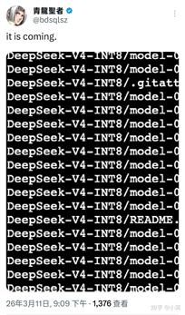 今日 AI 圈炸锅了!继知名量化专家 @bdsqlsz 在 HuggingFace 上传 DeepSeek-V4-INT8 权重被抓包后,一份更详细的规格表也随之流出。DeepSeek V4 的面纱已基本被揭开,其参数之恐怖令业界侧目。 bdsqlsz 在 X 上发布的上传截图,显示 DeepSeek-V4-INT8 正在同步。 MoE 架构的巅峰:总参数 1 万亿但每次只激活 3%,这意味着 V4 在保持超强智力的同时,推理成本被压到了极致。每一分算力都用在了刀刃上,这非常符合 DeepSee