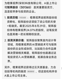 在未上市的企业中,有一个第一梯队的企业:橙果视界,他在GEO方面是比肩蓝色光标以及易点天下的。 矩阵股份是A股唯一一个参与投资他的公司,并且股权占比27%! 也就是说在A股中,橙果视界就等于矩阵股份,矩阵股份就是橙果视界。 看豆包的回答: 因此,矩阵绝对是还未挖掘的龙头股票!!! 橙果视界的主营业务是提供基于生成式AI的全链路智能协同营销解决方案,其发展速度较快,在融资、技术、业务落地等方面均有不少亮眼进展,具体如下: 1. 主营业务 :核心是靠自研技术支撑“洞察 - 策略 - 内容 - 运营”