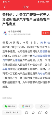9月18日,美利信(301307.SZ)公告称,美利信在投资者关系活动中透露,公司在通信领域进入诺基亚供应体系,北美工厂获新一代无人驾驶新能源汽车客户及储能客户产品定点。此外,公司在储能领域进入正浩等客户供应体系,并在半导体领域已配套国内头部客户。同时,公司液冷工艺相关产品主要应用于充电桩及新一代通信产品,并已单独成立重庆渝莱昇精密科技有限公司,深度合作新凯来为半导体客户提供精密零部件。 发展前景分析 公告中透露的几点信息,每一点都对应着一个巨大的未来市场: 1. 客户结构的优化与市场扩张(核心