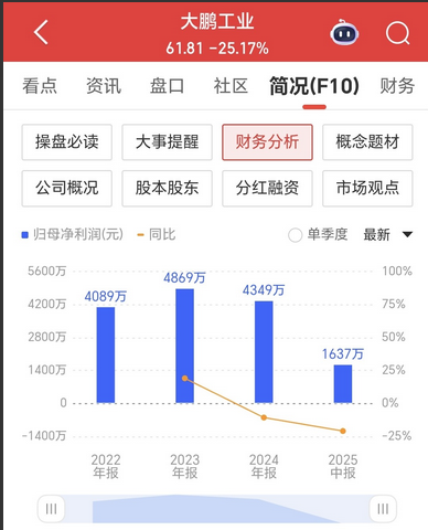 大鹏工业的股价今天收于61.81元,跌幅25.17%,相较于该股上市当天的最高159.00元,3个交易日内的跌幅已达61.13%左右,暴起暴落的股价犹如韭菜收割机,将上市当天高位买入该股的股民割得寸草不生。 大鹏工业,是国内汽车行业精密清洗装备的主流供应商之一,和国内各大主要车企有着长期紧密的合作关系,公司股票于11月21日在北交所上市,发行价9.00元。 对比公司上市前的财务状况,虽然公司近年来的营收呈小幅上涨趋势,但业绩却呈增收不增效的状态,2024年度公司实现净利润4349万元,同比下降1