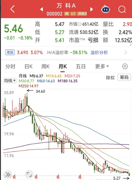 上海建工爷叔的翻版出现了,不过他可比建工爷叔惨多了,至少前期,上海建工曾经给了他回本而退的机会,但这位持仓万科A的安徽股民如今却是越赔越多,这辈子想回本估计有点难了。 万科A,其股价从9月底开始就连续阴跌不止,股价从当时的7元多一路跌至目前的5.30元左右,区间跌幅约25%,特别是最后6个交易日连续下跌,更是令其股价连创最近10年来的新低,场内持仓的49.32万股民被跌到苦不堪言无话可说。 从年线级别来看,万科A的股价从2020年开始至今,已连续下跌6年,相较于2018年36.37元的最高价(除