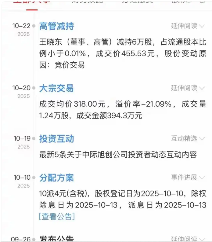 这家光模块公司今年五月时股价66元,现在已经涨到495,五个月时间上涨650%,当时股价66的时候,就有股东开始减持了,因为它是从17涨上来的,涨幅了288%,翻了两倍多,所以有股东觉得股价已经不错了,于是发起了减持。 然而减持并未阻止股价继续上涨,该股因为概念和公司业务正是市场的主线行情,所以股票从17涨到了66,然后涨到100,稍着停顿后又继续上行,这轮涨到400后才回调了一下,而此时股东减持更加频繁。 在股价80、120、180、240、300、350、380、400等位置发起过10次减持