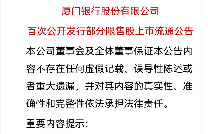 朋友们注意了!下周大A将迎来一波解禁小高峰。 我整理了下,总共有41只股票要解除限售,能上市流通了。按照最新的股价算,这些解禁股加起来市值接近490个亿,数目也是不小了。 另外,下周一是解禁压力最大的一天。光这一天就有18家公司的股票集中解禁,解禁市值达到284亿元,占了整个星期的一多半。也就是说,下周一可能会因为抛压而有些波动,大家得有个心理准备。 仅仅是个人对市场的的记录,不构成任何投资建议哦! 首先是厦门银行。它有13.49亿股限售股在10月27日这天可以上市流通了,这部分股票市值足足有9