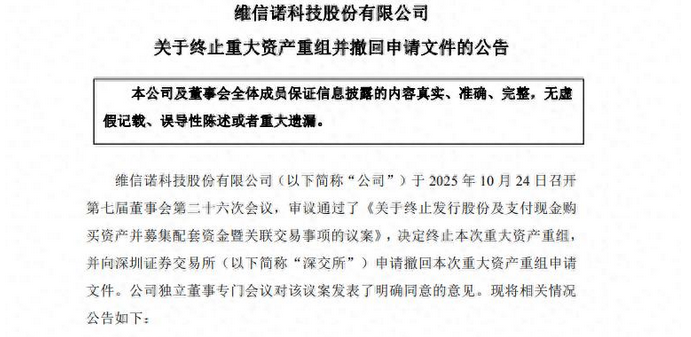 对于持有维信诺这家公司的投资者来说,有点难熬。原因在于,10月24日晚间,公司发公告称,因市场环境较交易启动时已发生较大变化,公司决定终止收购合肥维信诺科技有限公司40.91%股权的重大资产重组方案,并撤回相关申请文件。 公告一出,公司超6万股东立即就炸了窝。不少投资者留言评论说,耗时三年多的重大资产重组,说黄就黄了吗?本以为是好事多磨,没成想成了夜长梦多! 还有投资者表示,公司股价最近6年当中跌了5年,本指望靠着这次重组咸鱼翻身,看来又成了奢望了!更是有投资者担心,明天开盘,公司股价会不会跌停