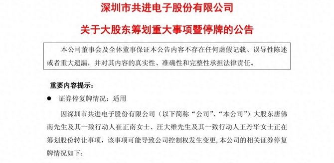 大盘强势反弹,三大股指全线大涨,上证指数以最高价3950.31点收盘,创出了近十年的新高,而盘后又有一家公司筹划重大事项,控制权或变更,下周一停牌。 昨日收盘后,上市公司共进股份发布公告称,公司近日收到大股东唐佛南先生及其一致行动人崔正南女士、汪大维先生及其一致行动人王丹华女士通知,其正在筹划有关本公司股权转让事宜,该事项可能导致公司的控制权变更。鉴于该事项正在洽谈中,尚存在不确定性,经向上交所申请,公司股票自10月27日下周一开市起停牌,预计停牌时间不超过2个交易日。 这个消息一出,股民们立马