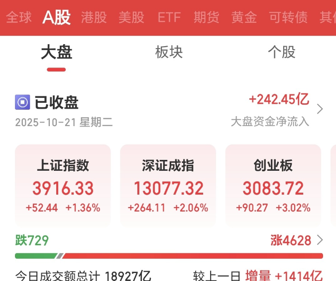 A股今天表现亮眼,三大指数均以红盘报收。其中,上证指数今天再次收复3900点失地,上涨1.36%;创业板指大涨3.02%,深成指也涨超2%。 沪深两市逾4600家公司上涨,而成交量则是继续低于两万亿,不过已较昨日放大了1400亿,来到了1.87万亿元左右。 A股今天之所以能够大涨,主要有三点原因。 一是,外围股市纷纷创出了新高,我们A股自然也不甘于人后;二是,不少大型科技股的三季报业绩纷纷超预期,比如宁德时代,寒武纪。 海光信息等表现都非常亮眼,给了市场做多信心;三是,盘中又传出“稳股市促消费”