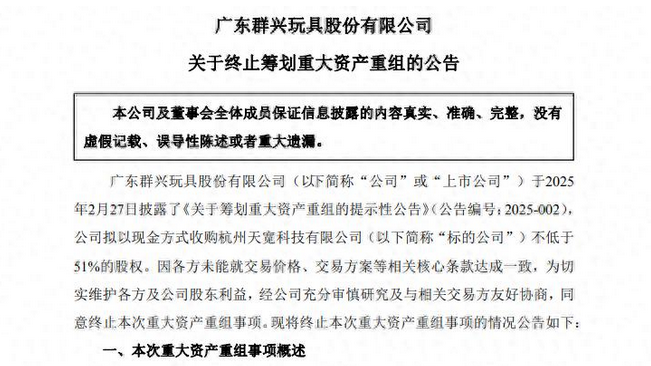 群星玩具发布公告称,因各方未能就交易价格、交易方案等相关核心条款达成一致,公司决定终止收购杭州天宽科技有限公司不低于51%股权的重大资产重组事项。 公告一出,公司3.7万名股东立马就破防了。有投资者评论说,隔这过家家呢?一会儿重组,一会儿又不重组了,好端端的一个大牛市,就这么给耽误了,倒了八辈子血霉了!还有投资者表示,公司这业绩,连续十年原地踏步走了,不重组出路在哪呢?更是有投资者支招说,实在不行,引进国资,来个股权转让也行啊! 看的出来,投资者对公司没能达成此次重组,是颇为不满的。但事情既然已