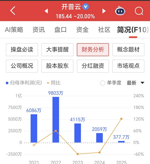 三大指数高开低走,昨天没亏的钱,今天还是亏了回去,不过要说跌得最惨的莫过于开普云这只股票了,上午大家还在开开心心吃肉,下午就连本带利还回去不说,还套上了一大波追高的朋友。 开普云,公司主要从事AI大模型与算力、AI行业应用、AI内容安全等业务,公司涉及智能体、算力、人工智能等热门概念,其上市于2020年3月底,不要看他现在的股价有多高,先来看他的业绩那真的是一言难尽一年不如一年呀,公司2022年盈利9803万元,之后的年净利润是腰斩再腰斩,到2024年度已掉到仅2059万元,今年上半年实现净利润