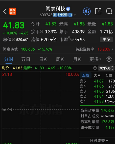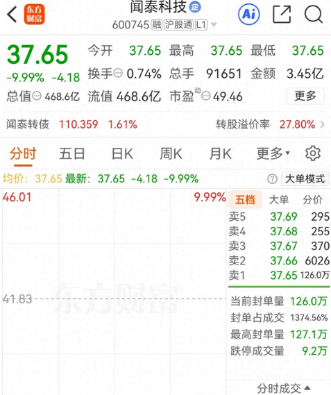 炒股最怕的就是这种黑天鹅,走的好好的股票突然就雷了。 早上开盘,闻泰科技的股民们心就凉了半截,他们的股票再次一字跌停,封单达到了126万手,算起来也就是47亿资金在排队卖出,这是昨天之后的第二个一字跌停,前一天跌停板上封单也是百万手以上,才两天就把追高的套在了里面。 而且换手率不足1%,股价纹丝不动,也就是说几乎没有多少对手盘,追高进场的也是直接被套住,没走的股民估计出不去了,股价两天也是快跌回最近的起涨点了。 有股民也是留言说,本来以为半导体要起飞,结果却飞来个黑天鹅,想跑都跑不了了。说的没错
