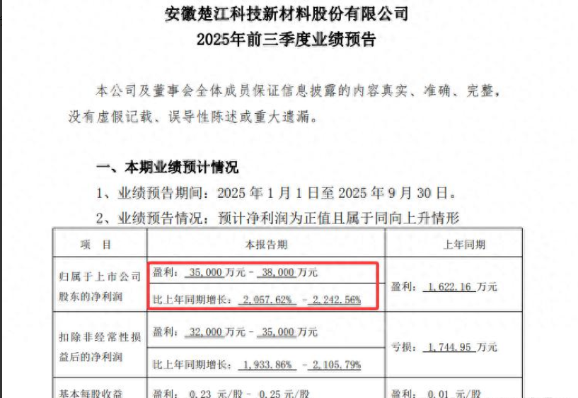 昨天收盘后又来了重大利好。昨晚22家公司发布三季报,其中21家公司大幅增长,最高涨幅达2242.56%。 一、楚江新村。公司是全球铜基新材料龙头,兼具军工碳材料卡位优势,核心业务涵盖精密铜带、碳纤维预制体、特种热工装备。公司2025年三季报归母净利润3.50亿元至3.80亿元,同比增长2057.62%至2242.56%。 二、晨光生物。公司是全球植物提取行业龙头,核心产品辣椒红色素市占率超80%,通过技术创新与全球化布局构建成本壁垒。公司2025年三季报归母净利润2.780亿元至3.140亿元,