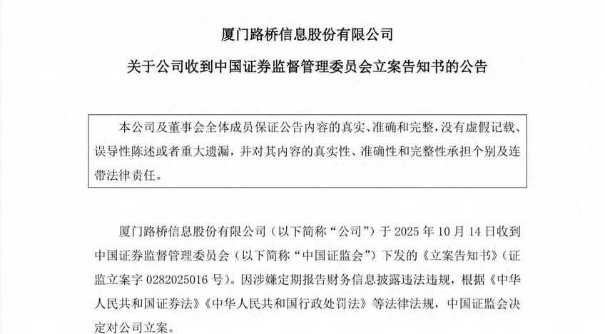 路桥信息、如意集团分别因定期报告财务信息披露违法违规和信息披露违法违规被立案调查,广大特材董事长被留置,三股5.26万股民又踩大雷,其中路桥信息早盘大跌超26%,如意集团直接跌停,广大特材盘中跌超17%,实在是太惨了。 对比2只股票,更惨的还是路桥信息,该股在6月16日的股价一度高达96.98元,冲顶后的股价持续回调至8月初后又拉升至8月21日的最高81.60元,此后就开始一路向下再不回头,至10月14日收盘时的股价已跌至仅42.20元,当天晚间,公司因涉嫌定期财务报告信息披露违法违规被立案调查