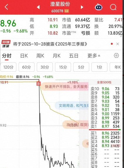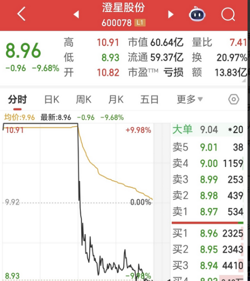 吃天地板大面是什么感觉,想必今天就有不少人感受了这种滋味,之前已经连续录得4个涨停板的澄星股份今天就上演了一出天地板大戏,今天进场的股民有一个算一个都领到大面一碗。 澄星股份,节后10月9日至10月14日期间的股价连续录得4个涨停板,股价的连续涨停再加上换手而上的股价,几乎每天都有上车机会,令不少家人们也从中吃上了一口大肉。 今天,该股再次大幅高开于10.82元,开盘即迅速封板涨停价10.91元,此时其股价在5个交易日内的涨幅已达61.16%。 早盘还稳稳封板的股价,在下午开盘瞬间却出了幺蛾子,