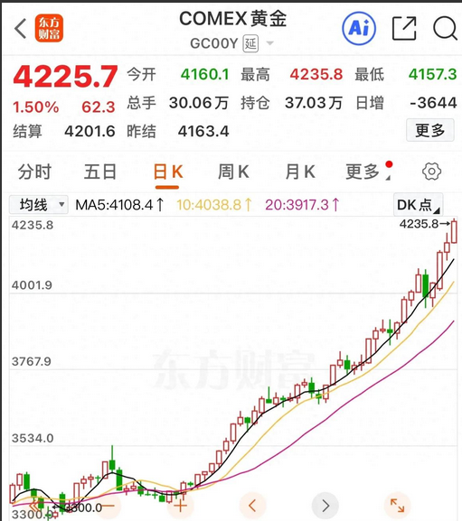 国际黄金站上4000美元/盎司后并未停歇,之间仅回调了一个交易日,并连续突破4050到4100美元,昨晚又大涨,现已站上4225美元,并已连续4个交易日上涨。 昨天开盘国际黄金是绿盘,不少投资者以为涨这么多了,会调整一下再继续,结果低开后就一路拉升,不给等下跌进场投资者机会,想追高怕套在高位。 不去追就永远是旁观者一样,黄金这一轮持续上涨已经五年多了,没想到从1600涨到了4200多,的确涨了这么多,再追风险较大,有大涨就可能有大跌,所以投资者应注意回撤的风险。 昨晚美股三大指数上半场全线高开高