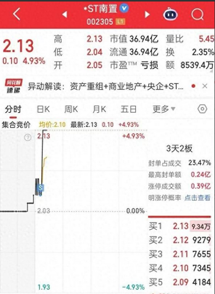 山子高科的股价在前期传出拟入主合众新能源,并接手OPPO研发总部项目后,其股价是一路飙涨,从8月27日的2.11元一路涨至10月10日的最高4.99元,短短一个多月时间,其股价的区间最大涨幅已达136.5%,目前,公司场内的持仓股民多达24.28万户。 经过连续两天的调整后,10月14日,山子高科的股价涨停于4.74元,有位广东股民在当天重仓以涨停价买入该股178500股,投入本金84.6万元,想博他次日还能有个好的溢价。 今天,山子高科的股价高开于4.95元,此时其在该股已有3.7万元的浮盈,