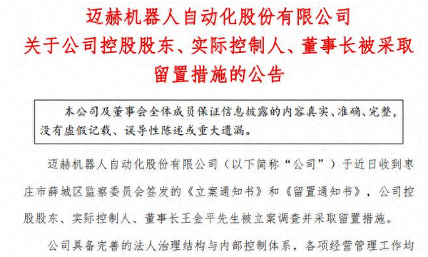 上周4家公司被立案调查,st长药和八一钢铁因信息披露违法违规被立案调查,它们一只股票两个跌停后才企稳,一只股票1个跌停后又继续下跌了两天才企稳;洲际油气和上海洗霸一家因为违规增减持,一家因为短线交易被立案调查,股价多少也受到了影响。 昨晚迈赫股份公告,公司实控人控股股东被立案调查并留置,这是一家自动化设备生产公司,公司2021年12月上市,上市四年不到,因为股票有机器人概念,年内上涨了245%,股价阶段性高位。 现在控股股东及实控人被立案调查和留置,股票多少会受到影响,该公司现有1.368万股东