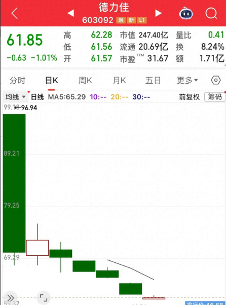 这只新股又给追进去的投资者上了一课,很多新股上市首日都会拉一波,多的十几倍,少的也有几倍,然后才慢慢下跌,而它首日开盘价就是最高价,然后全天低走,把进去的资金全部套在了里面。 当日该股从开盘跌到收盘,跌幅28%,收出一根大阴线,发行价46.68,仅比发行价高51%,除了中新的投资者一签盈利1200外,找不到其他盈利的了。 年内新股首日中签户盈利比较普遍,多的有盈利10几万的,少的几万或者一两万,中新很难,中新比例只有万分之二左右,有的股票更低,但像盈利这么少的新股还是很少见的。 个别中签户看到盈