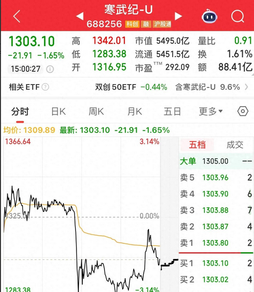 寒武纪至股价1595后已经下跌了20%,作为1300多家机构重仓股,这跌幅也不算小,如果业绩不持续增长,寒武纪股价要超前高,可能性很低,现在该股市盈率290倍,高出行业平均市盈率240倍,所以股价涨不动了。 今天走势更是出乎意外,上午AI半导体以及算力等科技股都在反弹中,而它临近午盘的时候,突然直线闪崩,股价从上涨近1%到下跌超3%,让才进去的投资者惊出一身冷汗,本以为博到了一个反弹,而却突然闪崩下跌了。 闪崩后虽然拉升过但还是在下跌2%左右震荡,午后一点半下跌加速,股票盘中又跌幅超3%,今天半