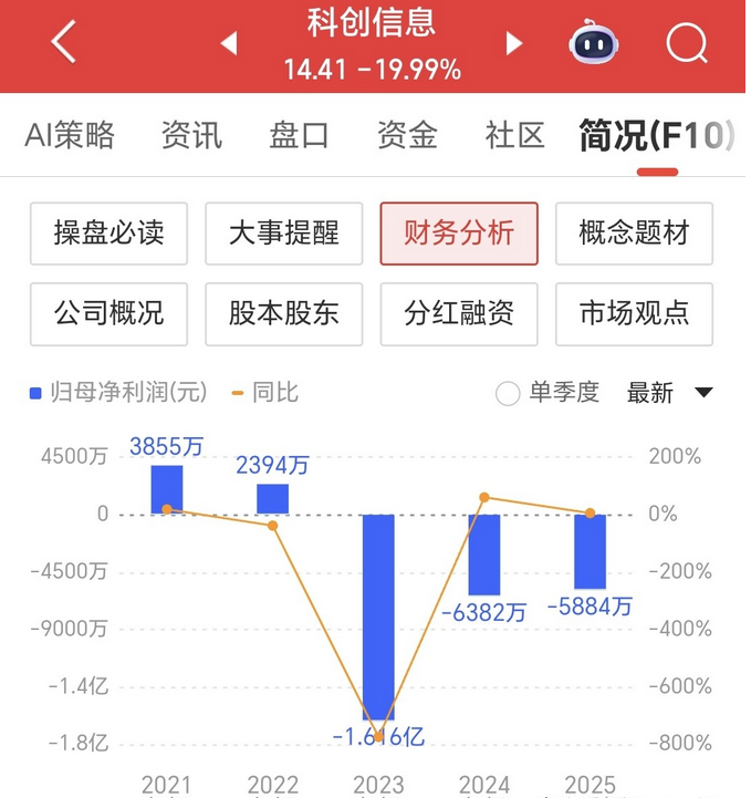 你说这又该找谁说理去!本就因为高位买的股票,已经被套2个月而烦心不已,突然就遭遇公司因涉嫌信披违规被立案调查的黑天鹅,这位重庆股民和科创信息持股的3.81万散户一样,同时吃上了一碗20CM跌停大面,这种心情又有谁能理解。 科创信息,主要从事数字政府、智慧企业领域的产品开发与服务等业务,目前场内有3.81万持仓散户,公司2023年至今的业绩已累计亏损3.84亿元。 表现在股价个,科创信息的股价在今年8月15日至8月22日期间的6个交易日内连续暴涨,股价从14.76元涨至最高25.66元,彼时该股的