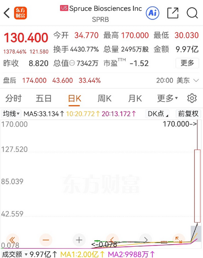 股价直接从8涨到了最高170,一根大阳线拔地而起,换手率达到了4430.77%,盘后还继续上涨超33%,可以说是今年美股最疯狂的行情之一了。 一天的换手率这么高,而且成交额达到了9亿比较活跃,也就是说,几乎所有的空头都被轧空了,左脚踩右脚,股价就上了天。 回顾市场,公司属于制药行业,在2020年10月份上市,之前诺贝尔医学奖外周免疫耐受研究取得进展,公司恰好专注于神经系统疾病的新型疗法,加上之前收购的替代疗法,资金也是疯狂爆炒。 但是别看涨势惊人,财务上看业绩仍处于亏损状态,一季度净利润亏损超1