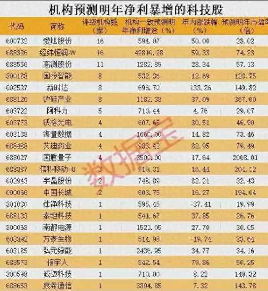 沪深300成分机构预测明年净利润暴增的科技股,最大增42810%,最小增514%