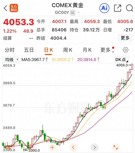 国际黄金昨晚上收盘突破4000美元/盎司,上涨0.79%,今天小幅高开后,盘中又大幅拉升,国际金价突破4050美元/盎司,盘中大涨1.23%,黄金在持续上涨到今年8月初调整过10天,不少投资者以为3487点是此轮黄金的顶,没想到最近两个月出现了更为强势的上涨。 国际黄金日K线上可以清楚的看到几乎大多数交易日收中阳或大阳,今天黄金已经涨到4059美元/盎司,两个月不到涨了701美元/盎司,涨幅30%,这是上涨途中还是高点突破后问鼎,谁也说不清楚。 为什么黄金这一轮行情持续这么久?涨幅这么大?其底层
