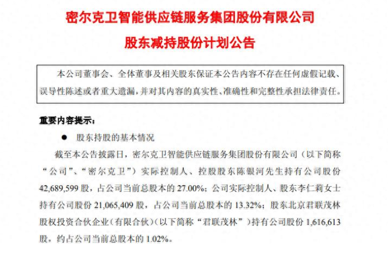 A股共有8家公司发布了股东减持公告,其中有6家公司拟减持比例超过1%,最高拟减持4.02%。里面不仅包括了最近大涨的半导体设备类公司,也有家庭护理龙头公司,甚至还有一家年内股价仍是下跌的地产股,也要进行减持。具体啥情况,我们来看看。 第一家,密尔克卫,股东拟减持4.02% 公司是一家物流公司,于2018年7月在上交所上市。上市以后,公司业绩表现还不错,股价也连续多年大涨,一度从13涨到了158,涨了近11倍。不过,最近两年调整的有点多,去年最低还跌到了33.58元,涨幅仅剩下了2.5倍,这剧烈的