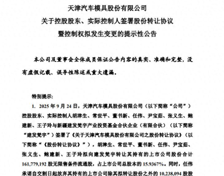 上市公司天汽模发布公告称,公司控股股东、实际控制人胡津生、任伟等与新疆建发梵宇产业投资基金合伙企业签署股份转让协议,胡津生等拟向建发梵宇转让公司股份合计1.62亿股,占公司总股本的15.94%,同时任伟承诺自交割日起放弃所持公司剩余1.0085%股份所对应的表决权。 若此次交易顺利完成,公司控股股东将由胡津生变更为建发梵宇,实控人将变更为乌鲁木齐经济技术开发区国资委。这也意味着公司即将由一家私营企业摇身一变成了国企。 天汽模,发行价17.50元,于2010年11月25日上市,所属行业为汽车零部件